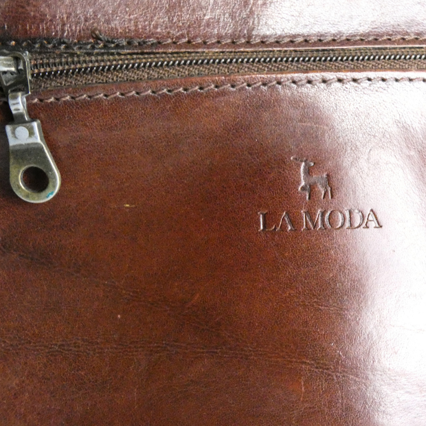 A label in the main compartment states the name MAN-MELIS Lederwaren. This is a leather goods store in the city of Tilburg (NL) die nog altijd bestaat. Of dat ook geldt voor het merk La Moda is niet duidelijk.