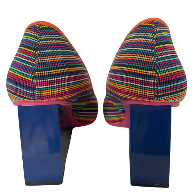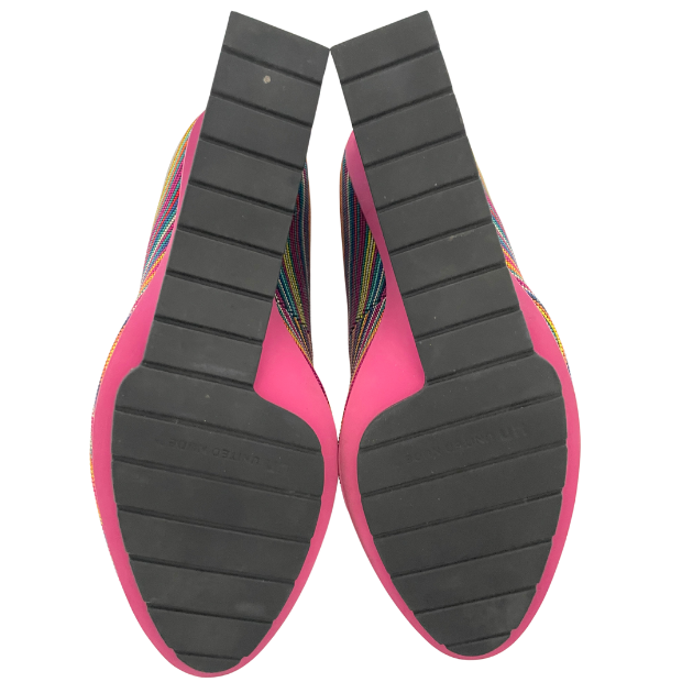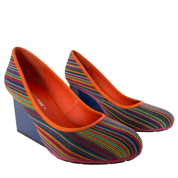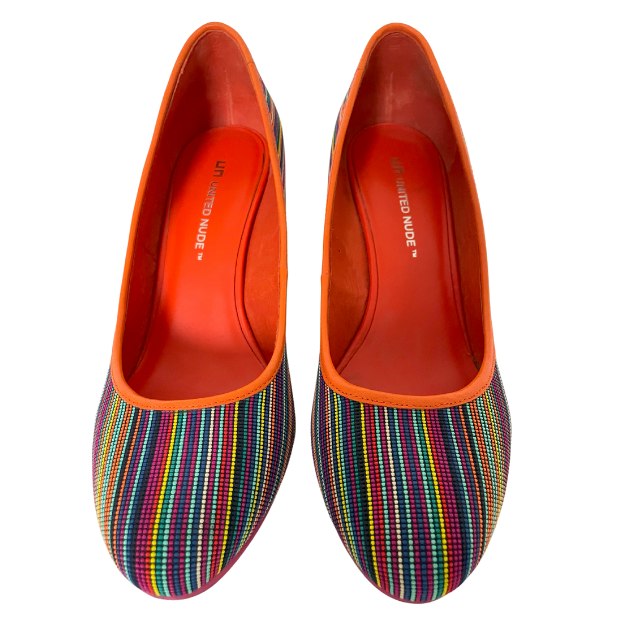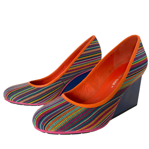 The shoes with the multi-coloured dots were launched around 2010 and have been an eye-catcher in every UN collection for 10 years. In this version, with the high-gloss wedge heels, you will not often see them!