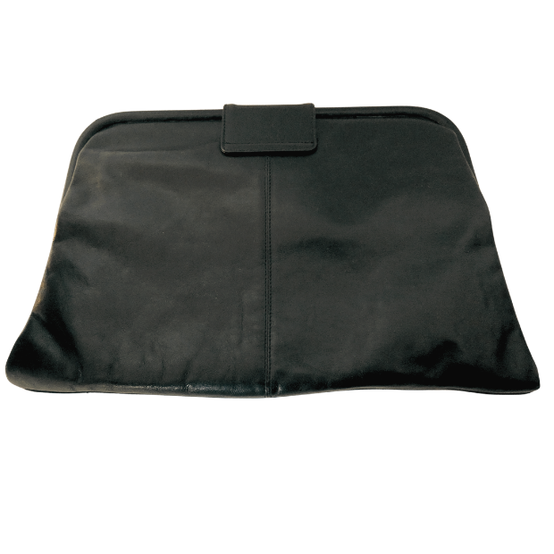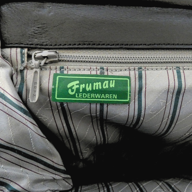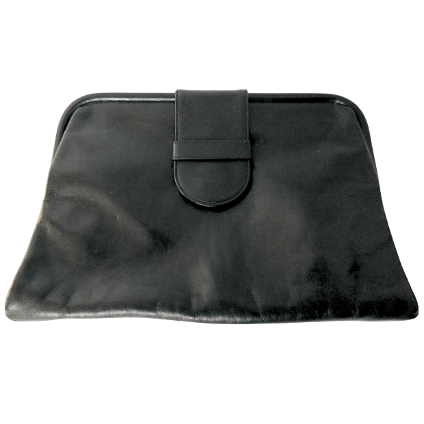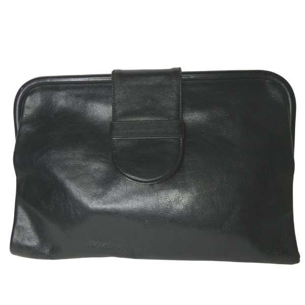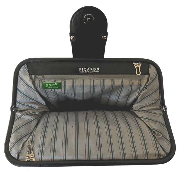 Black trapezoidal clutch/ shoulder bag, made of beautiful black cowhide leather. The clasp is lined with the same leather. A flap that falls forward from the back of the bag over the bracket and appears to have been pulled through a loop hides a magnetic press stud. The lining is a shiny grey fabric with narrow, woven-in burgundy and dark green stripes. There are also diagonal grey stripes between which the name Picard is woven in alternation with the characteristic mirrored P's.