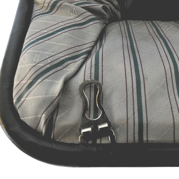 On the inside, diagonally opposite each other, there are two hinge eyelets attached on the bracket to which a shoulder strap could be attached at your choice. The original shoulder strap has been replaced by a new one. The original shoulder strap is no longer present but I have added a beautiful new chain, just like it was fashionable in the 1980s!