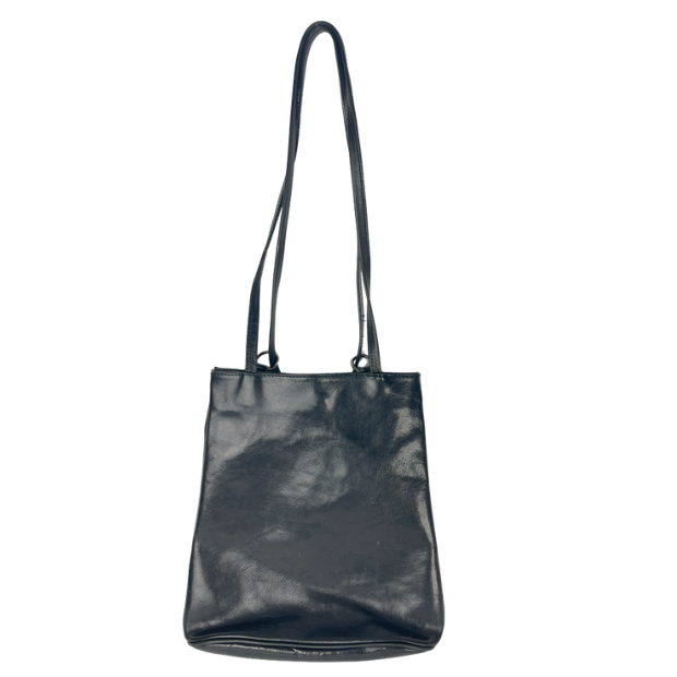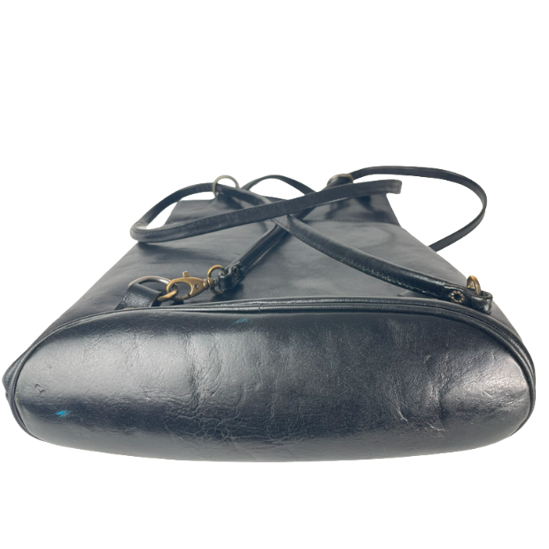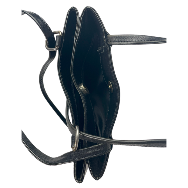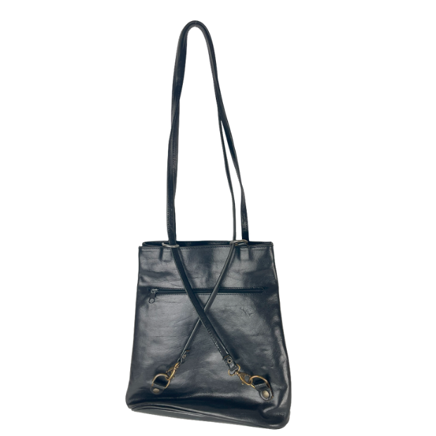 Deze ogenschijnlijk eenvoudige tas is vervaardigd uit hoogwaardig zwart leer. De hengsels zijn zo ontworpen dat ze eenvoudig van ‘gewone’ schouderriemen omgezet worden naar rughengsels. Op deze wijze kunnen ze kruislings op de rug gedragen worden. Zo verandert de tas moeiteloos van schoudertas in rugzak.